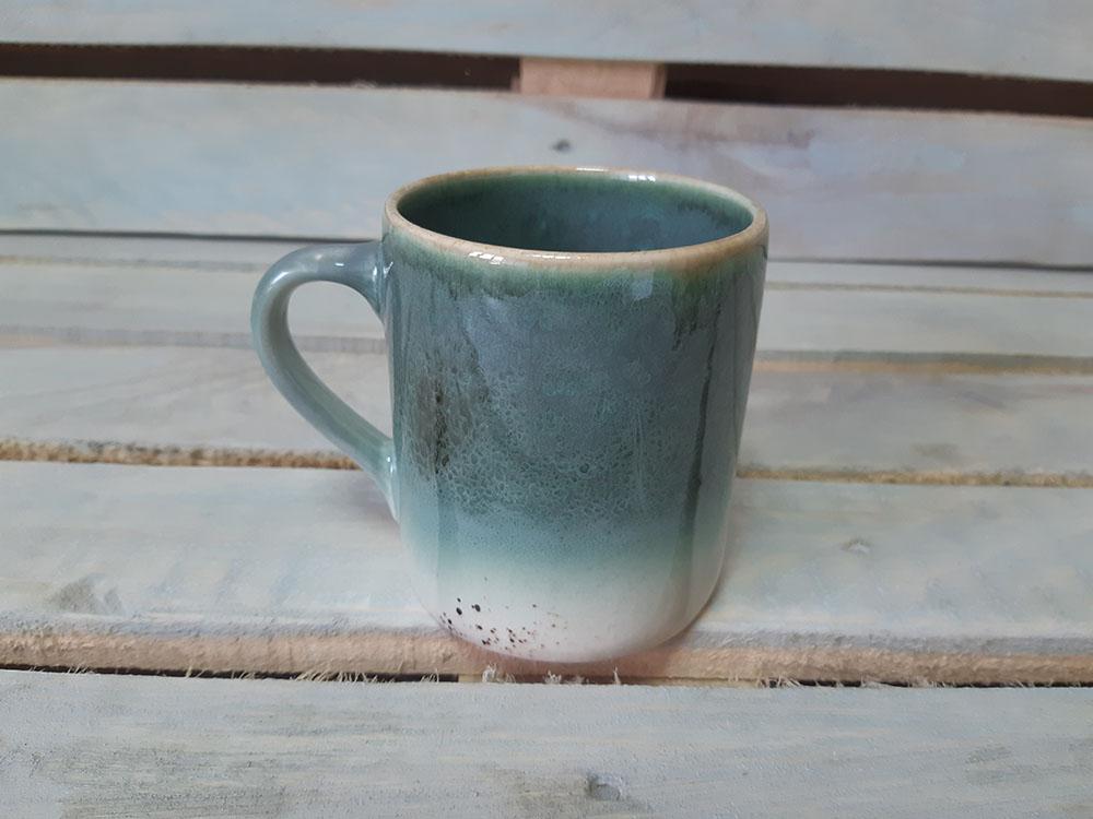 Классическая кружка объемом 0,35 л. Незаменима для подачи горячих и холодных напитков. Пригодна для использования в посудомоечной машине и микроволновой печи. Зеркальная зеленая глянцевая поверхность на кремовом фоне с загадочными разводами, бликами и черными крапинами.